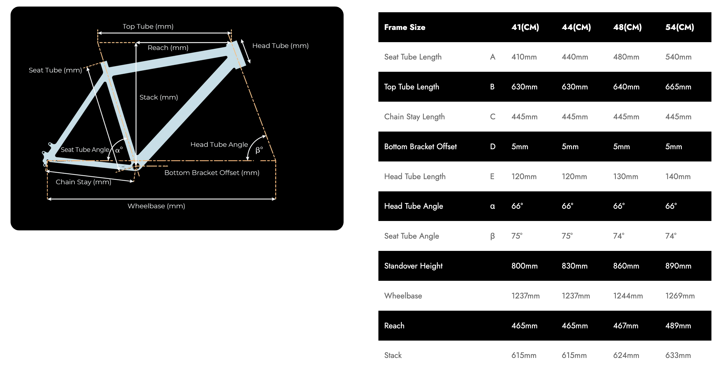 - Frame: Tough 6061 aluminum frame with internal cable routing. Sizes: 41 / 44 / 48 / 54 cm.